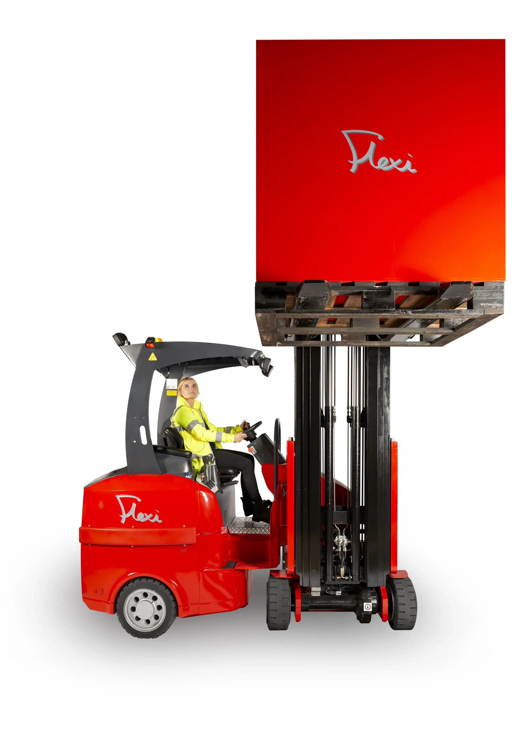 Carretilla elevadora Flexi 15 en acción, elevando un pallet de carga mientras el operador observa la maniobra.