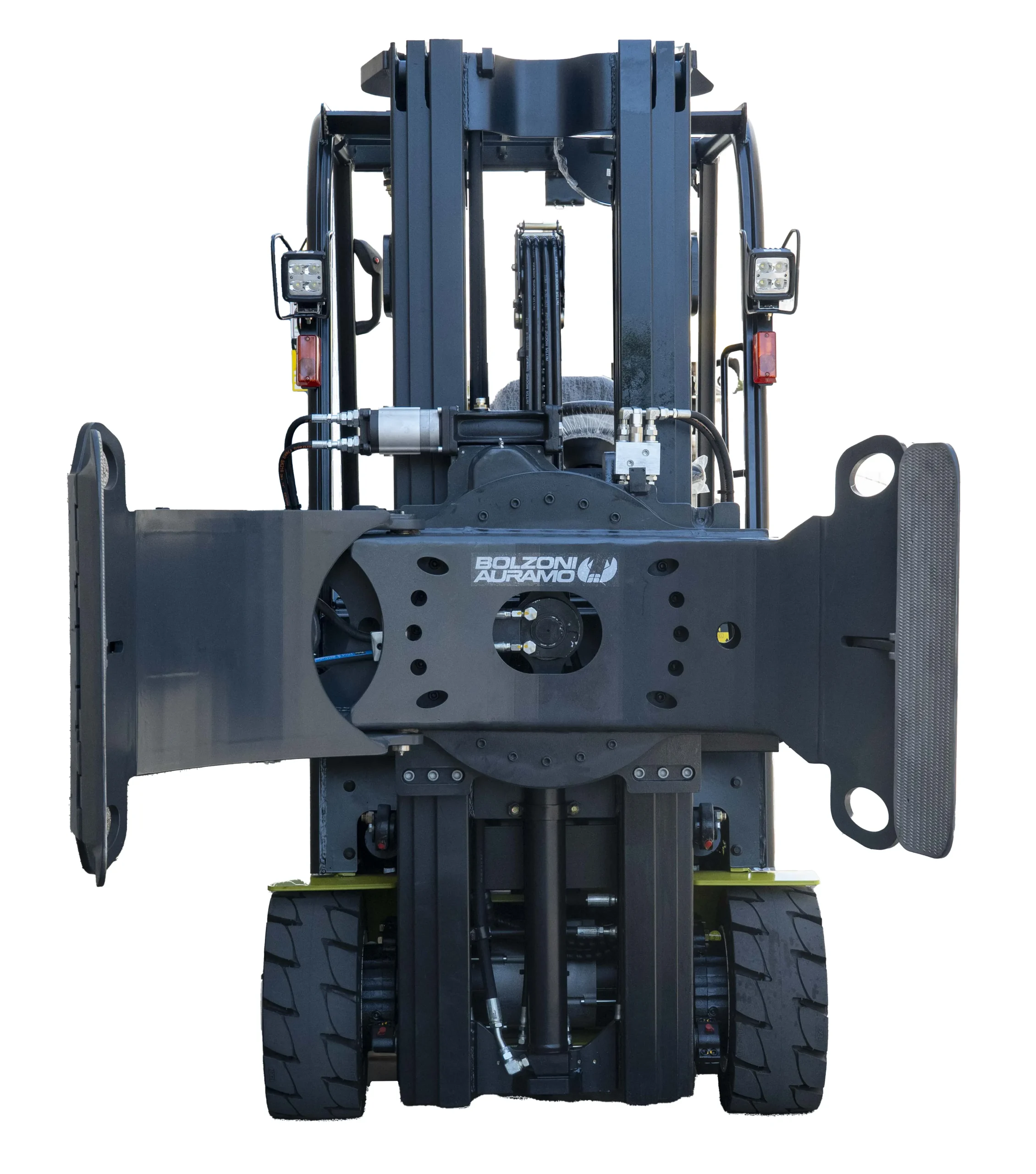 Vista frontal de una carretilla elevadora equipada con pinzas Bolzoni Auramo, diseñadas para la manipulación eficiente de bobinas de papel en entornos industriales.