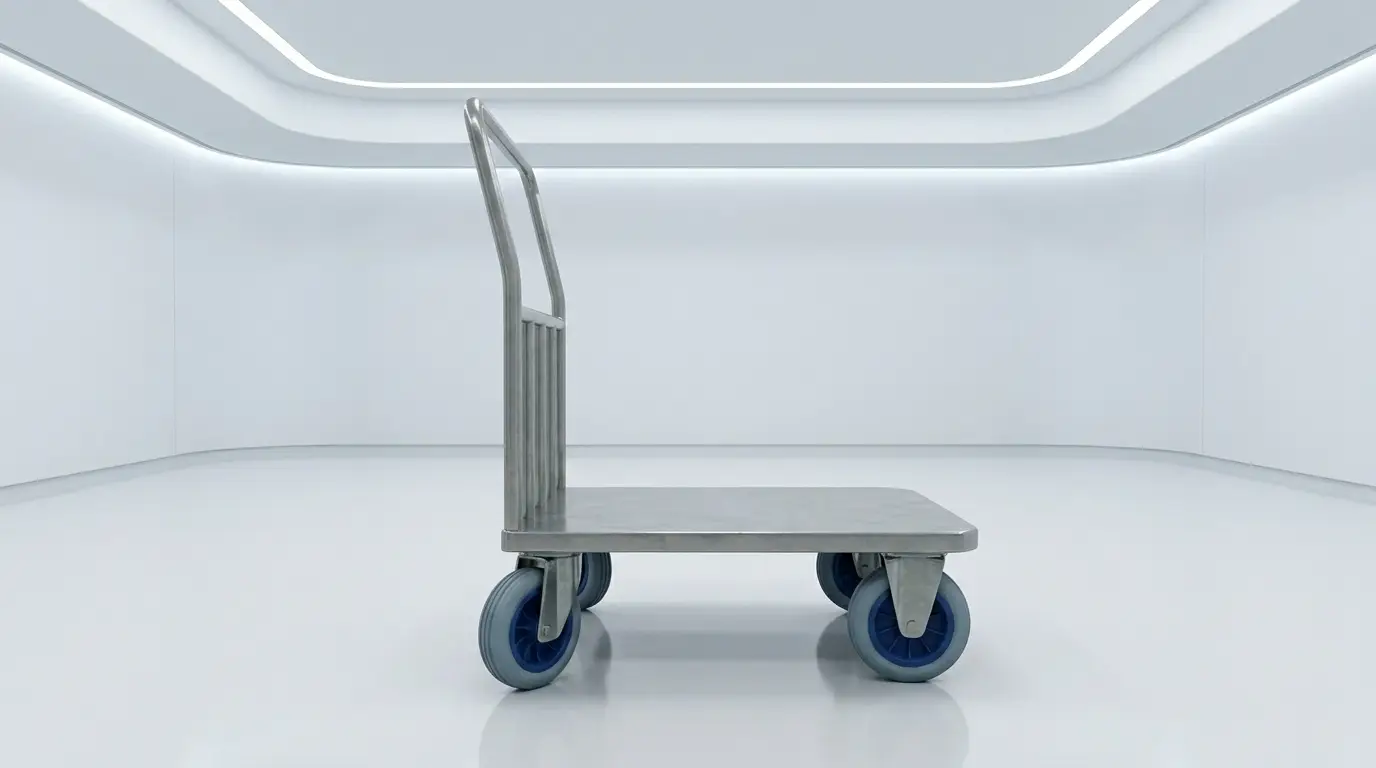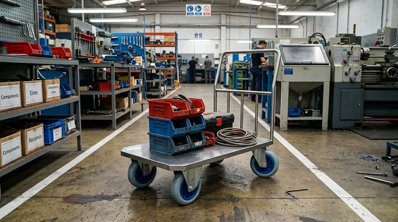 Con una capacidad máxima de 800 kg, esta plataforma de carga está diseñada para el transporte intensivo de materias primas, productos terminados o maquinaria pesada. Su superficie de chapa inoxidable proporciona una base plana y estable, ideal para desplazar cajas, contenedores o bultos de gran tamaño con total seguridad operativa dentro de la planta.